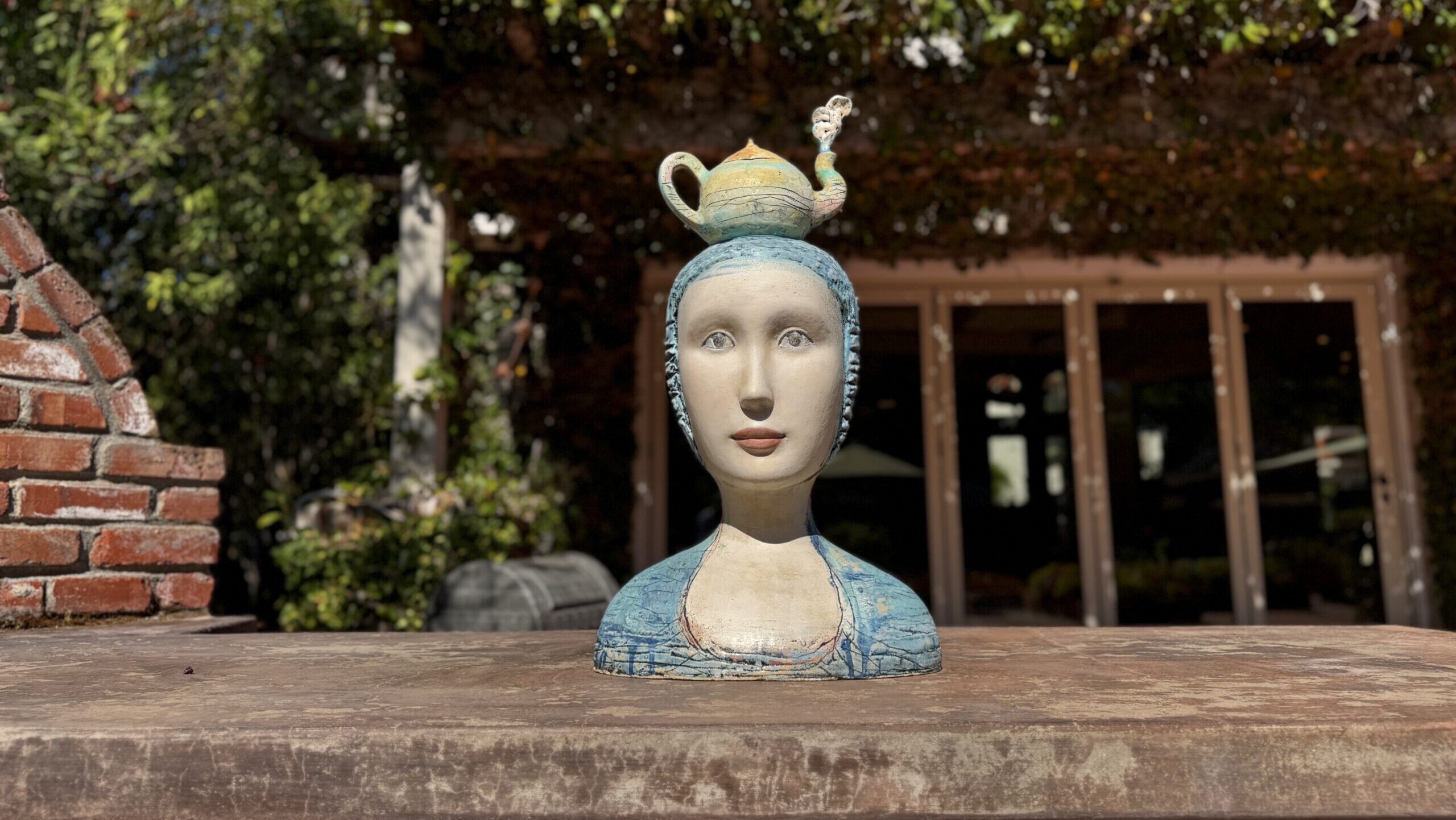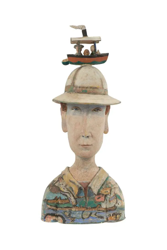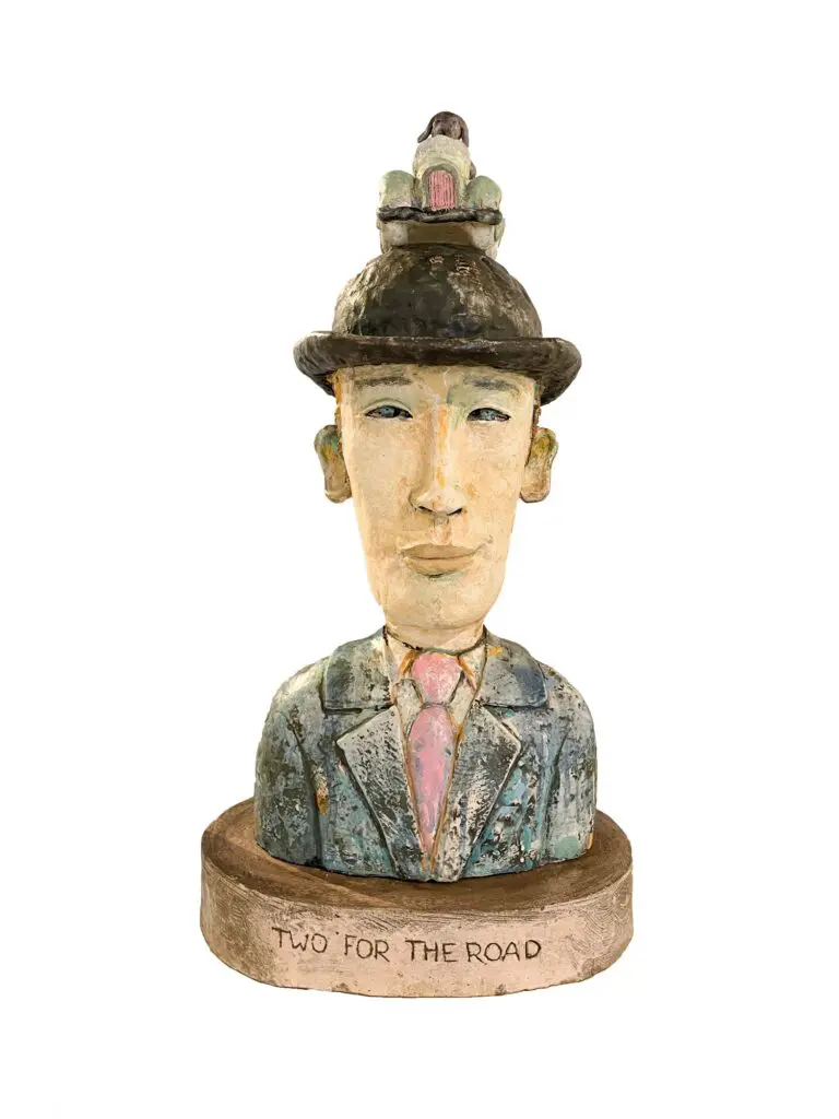 His ceramic busts — with signature elongated faces — tell a story, many times with an object on top, such as a boat, car or teapot. Each one is an echo of something he’s lived, survived or overcome.