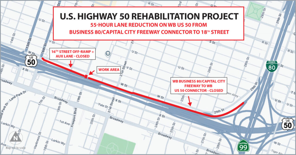 Caltrans plans more roadwork and lane closures on Highway 50 near Sacramento’s central city this weekend.