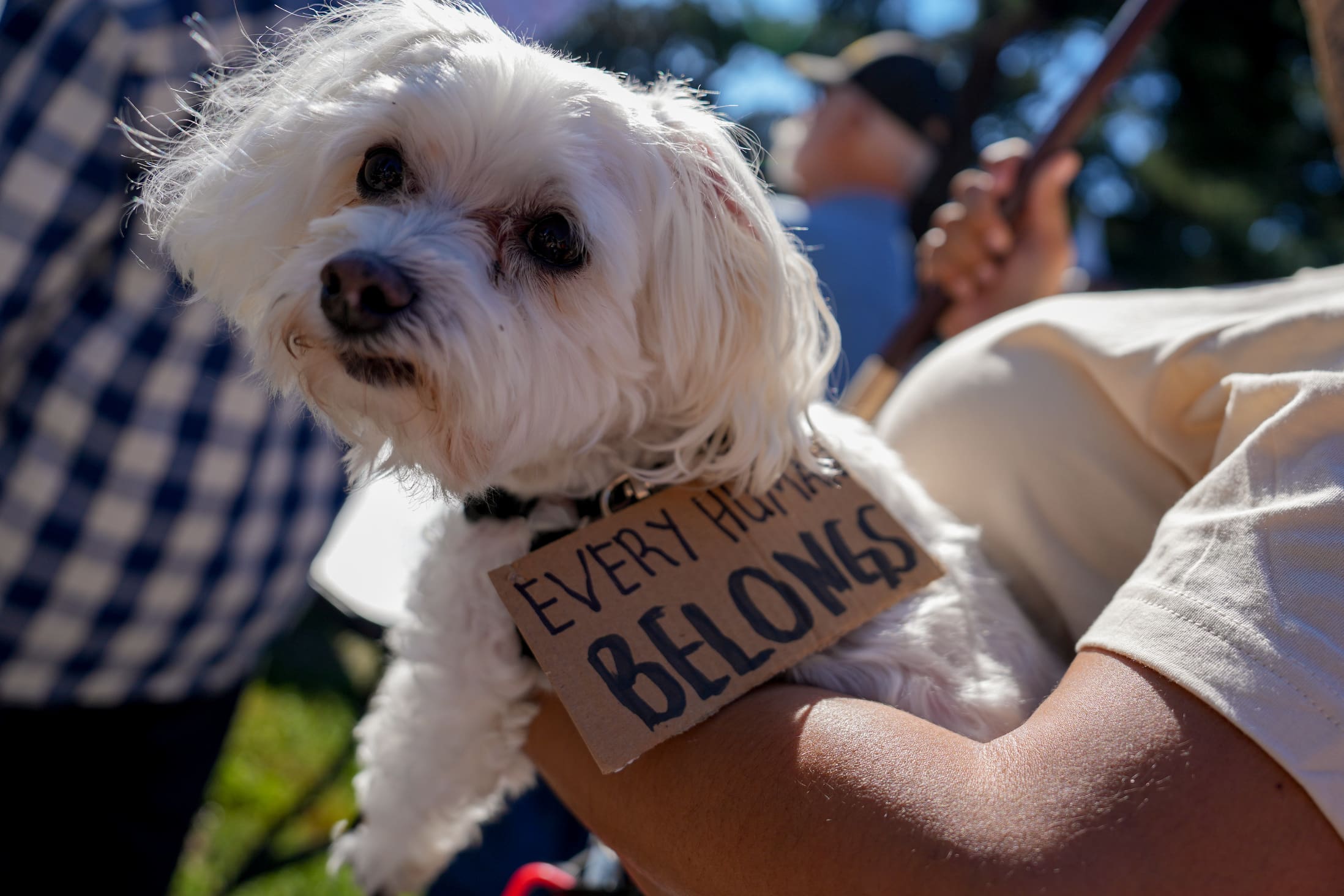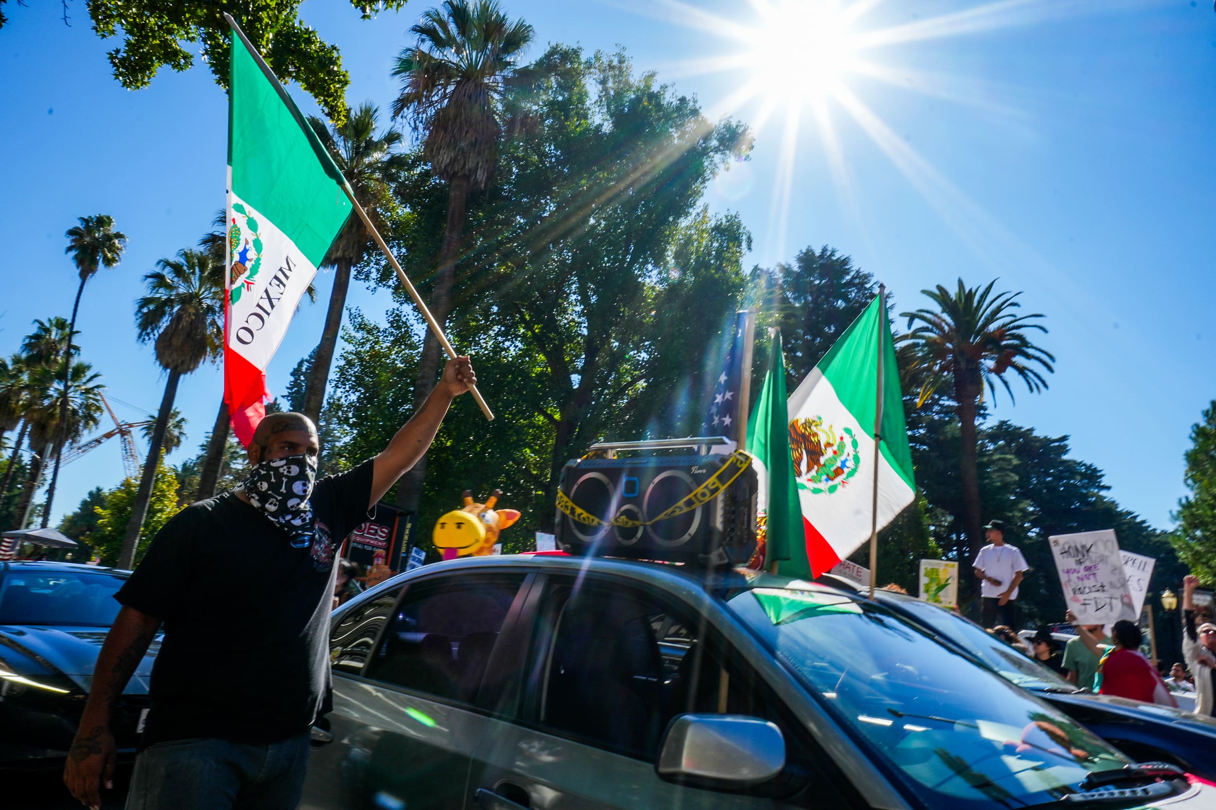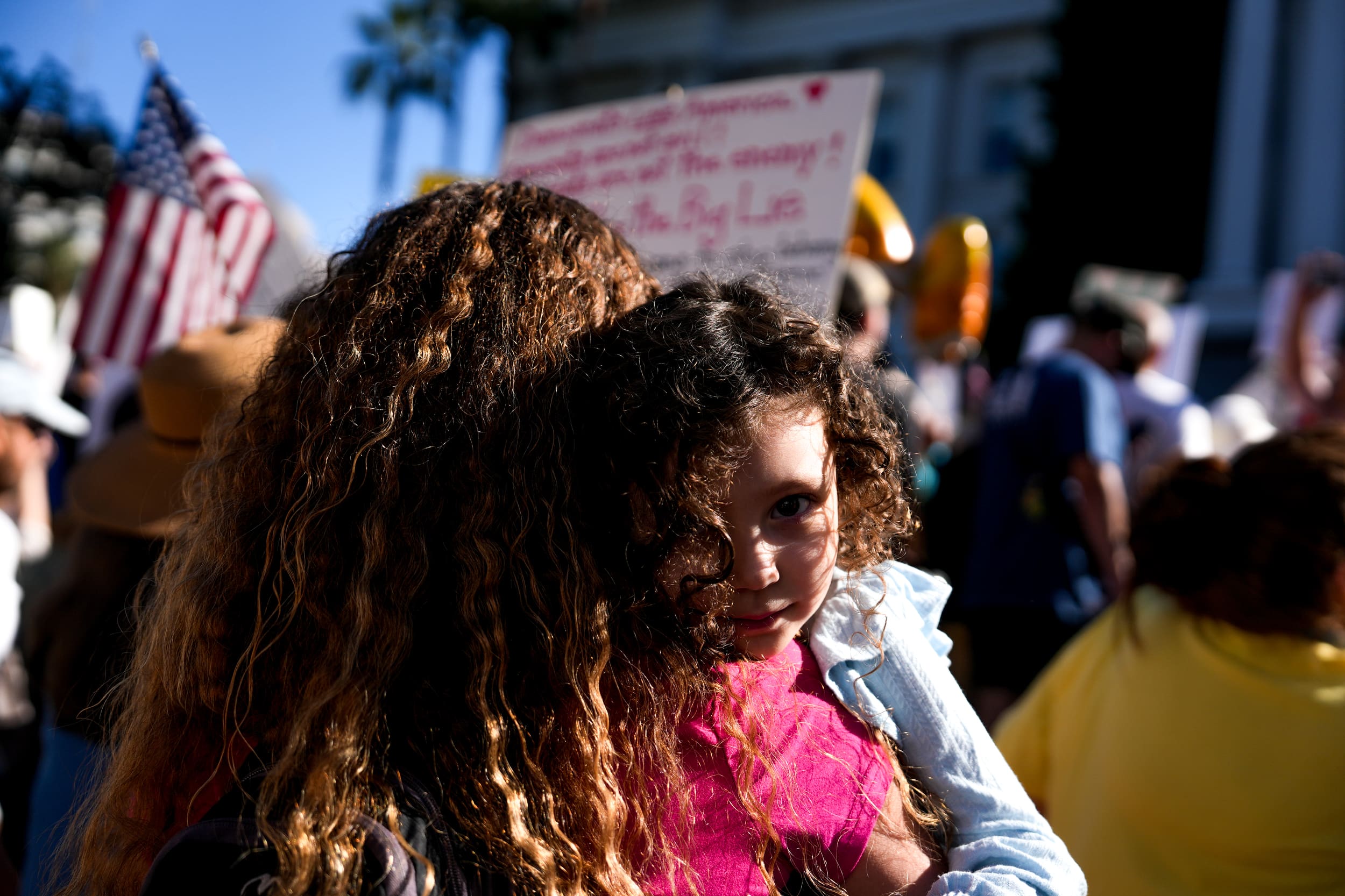 The morning began with a march of about 400 people from Sutter’s Fort State Historic Park to downtown, where they joined thousands more protesters at the west steps of the Capitol and surrounding streets.