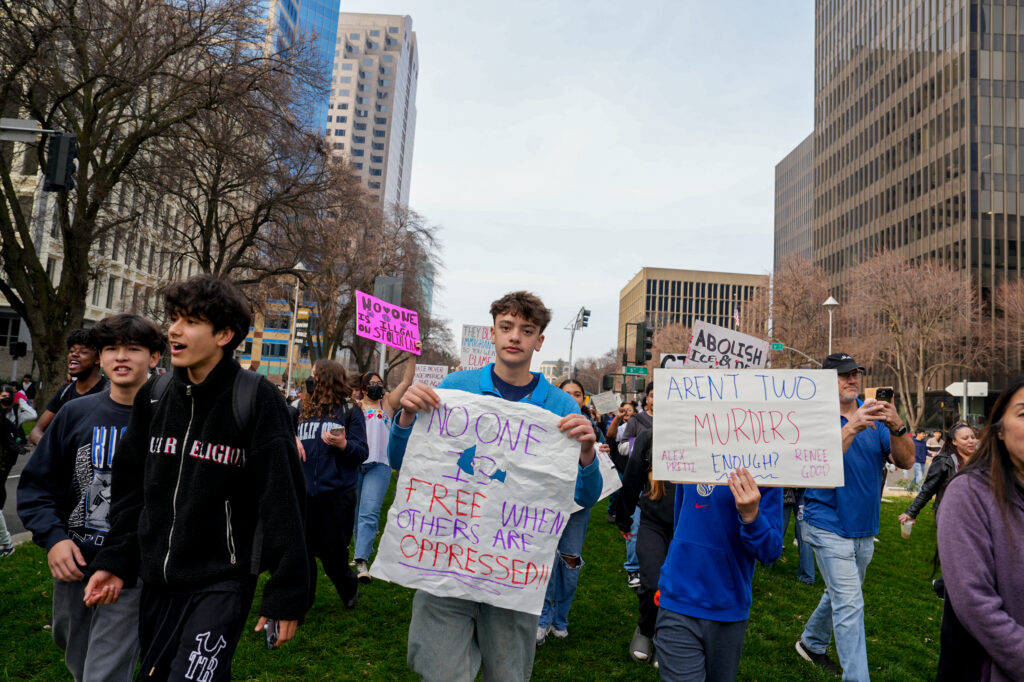 Students from at least 10 high schools across the Sacramento region walked out of school on Friday to protest U.S. Immigration and Customs Enforcement and federal immigration policies. Many took public transit from school to the Capitol, where they gathered for speeches, then continued to march to the John Moss Federal Building.