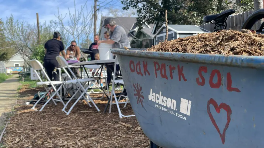 It’s spring planting time on a misty March Sunday morning in Oak Park. Small, brilliant pink and yellow signs of life jump up among the moist brown weeds and clumps of grass that winter left behind.