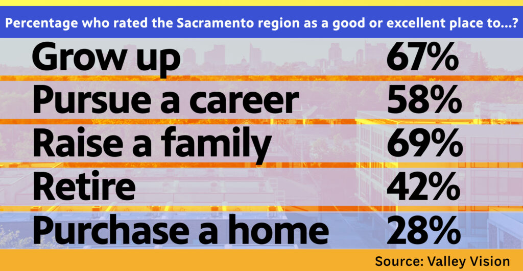 • Aside from housing, Sacramento region residents gave their home counties high marks: 69% said the area is a good or excellent place to raise a family and 58% said the same for pursuing a career here.
