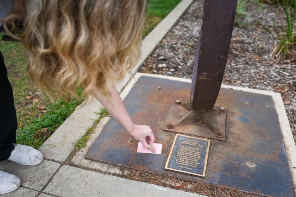 Tucked behind the neat rows of roses and carefully trimmed grasses of the McKinley Rose Garden, a small creature smiles aimlessly into the park.