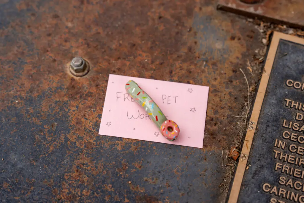 About 4 inches long and wormlike, a bright strawberry doughnut has been attached to its ceramic head and rainbow sprinkles dot its back.