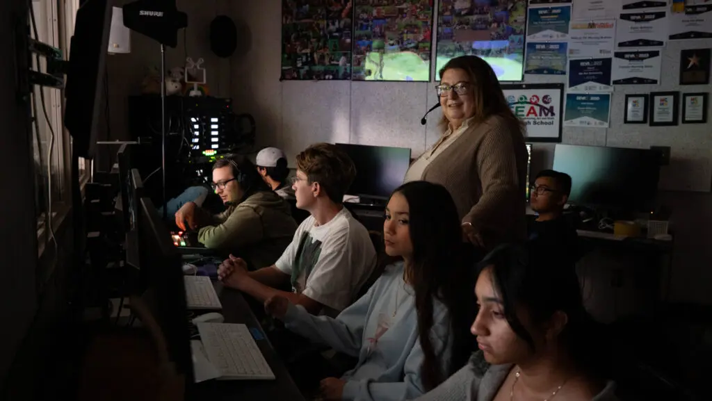 Students on the Wildcat TV crew at Franklin High School are gathered, as they are most mornings, before first bell in Dawn Williams’ media classroom.