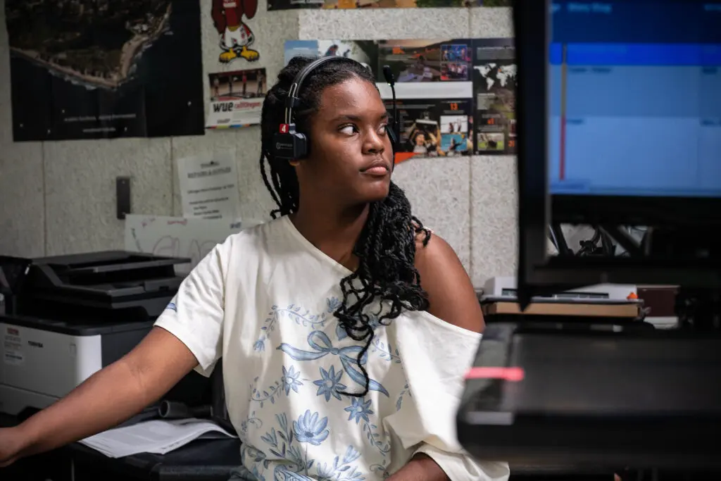 The space is fashioned as an operating television studio, with a row of cameras pointed at polished anchor desks (donated by ABC10) underneath a ceiling of production lights. A darkened control room punctuated by bright screens peers out behind glass windows. Students buzz around the set, speaking directions into headsets or testing microphones pinned to their collars.