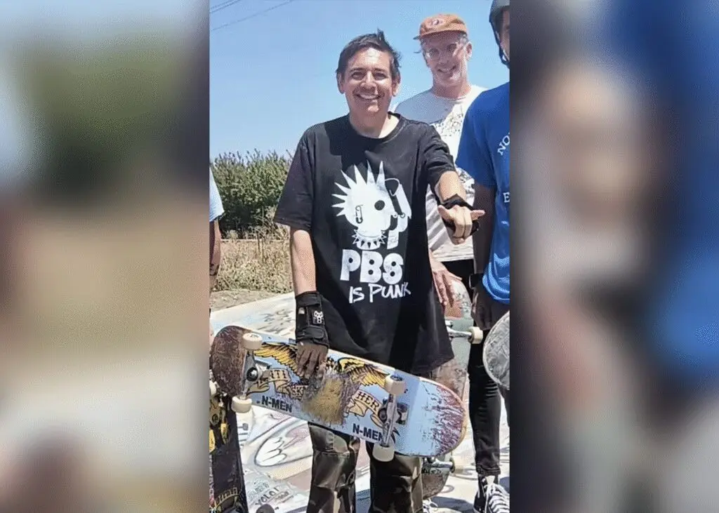 Chris Macias in the PBS is punk t-shirt at the Davis Ditch following a skate session in August. (Courtesy Chris Macias)